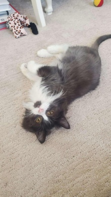 Not much is known about Melvin, as there were no records at the breeder’s house or on her website about him. Given the condition he was found it, it is believed he wasn’t considered to be of any value. What we know of Melvin is from a visual inspection of him. He appears to be a 5 to 6 month old black and white long leg Minuet.
